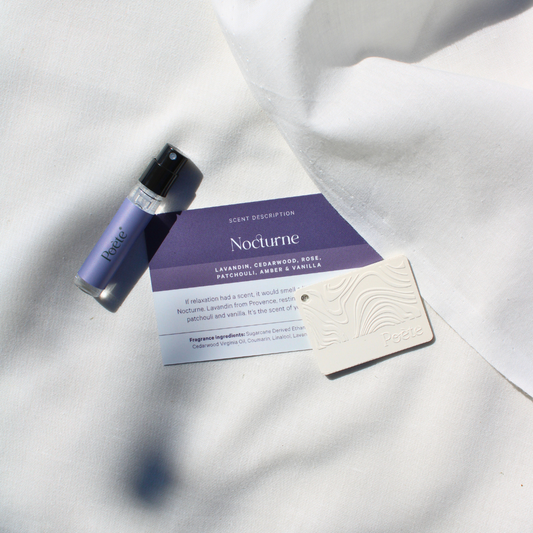 Nocturne — A fragrance of relaxation, infused with calming lavandin from the fields of Provence. With warm precious woods and amber, resting on a soft bed of musks, patchouli, and vanilla. Garnished with a glimmer of grapefruit.